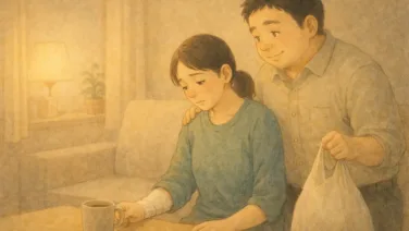 利き手を骨折した妻を前に、何もできない自分に戸惑った日。支えたいのに距離がわからない——そんな夫の視点から、そっと寄り添う気持ちを描きます。